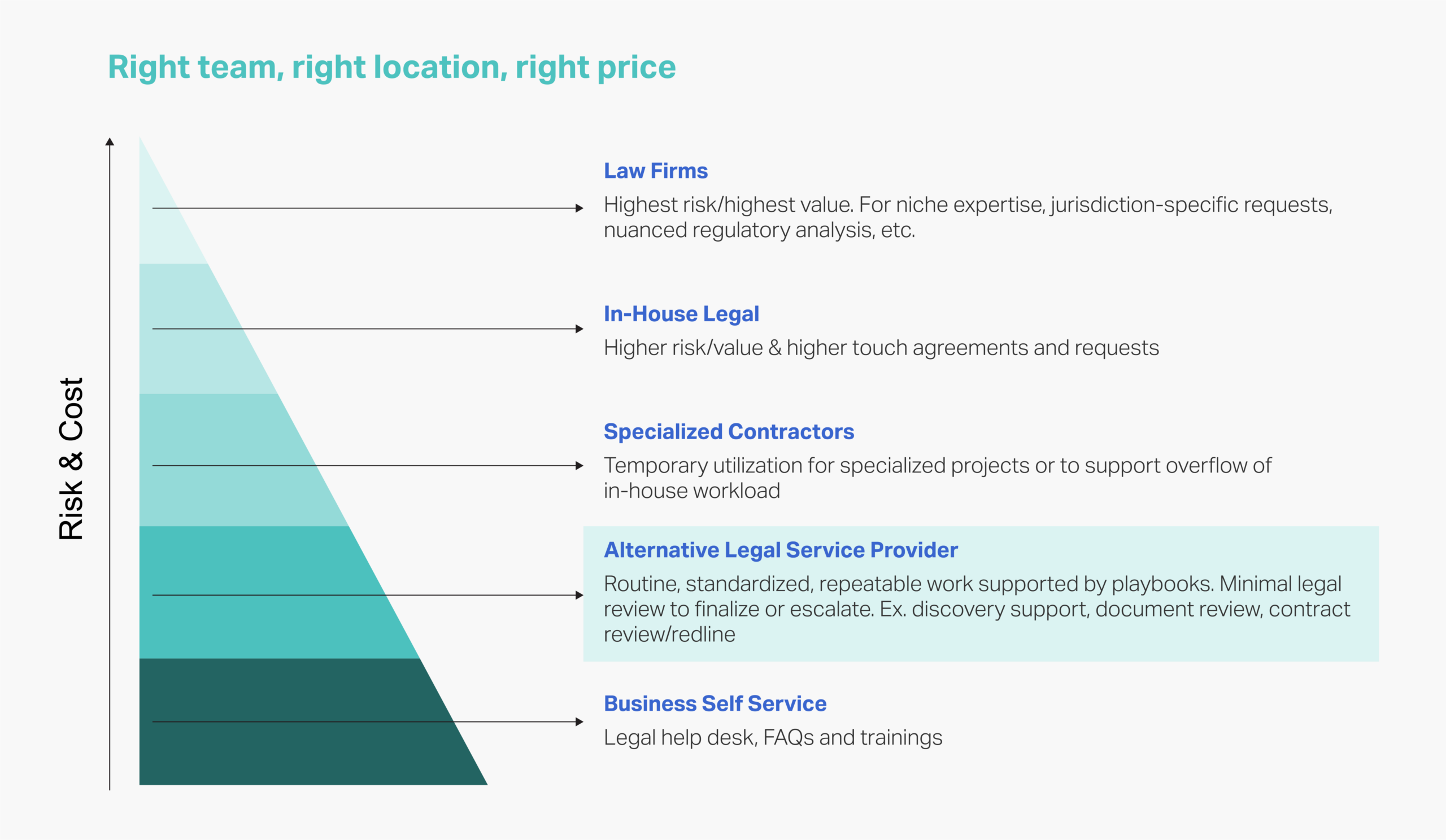 Simply sending overflow work to law firms or hiring more internal resources without appropriate work segmentation can lead to increased costs without resolving underlying inefficiencies.
