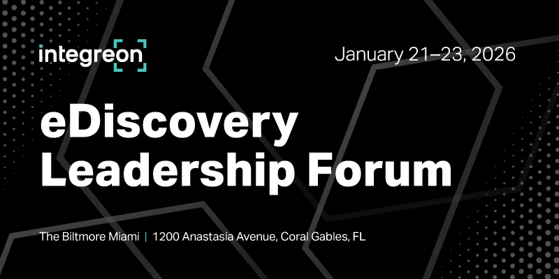 Integreon will be particpating in the inaugural eDiscovery Leadership Forum, taking place January 21–23, 2026, at the iconic Biltmore Hotel in Coral Gables, FL. This invitation-only event will convene top corporate decision-makers and handpicked law firms, service providers, and software vendors for an exclusive, high-impact experience centered on the future of eDiscovery.
